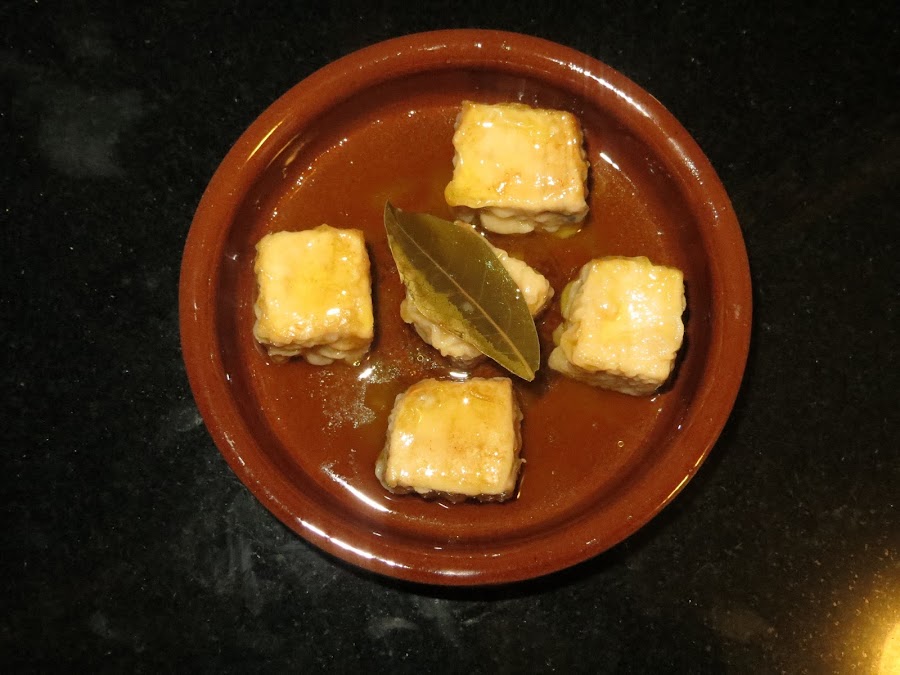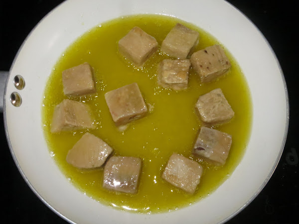 Se cuela el aceite y se fríen los dientes de ajo, el laurel y los granos de pimienta. Cuando estén fritos los ajos, se retira la sartén del fuego y se echa el pimentón. Se añade el vinagre y el vino blanco y se echa todo encima del atún, se mira cómo está el punto de sal y se deja cocer a fuego bajo durante 30 minutos. Luego se retira del fuego y cuando se enfríe ya está listo para degustar, aunque yo lo prefiero de un día para otro.