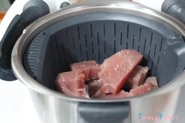 Ponemos el atún en el cestillo y este dentro del vaso. Cocinamos 15 minutos, temperatura Varoma, giro izquierda y velocidad cuchara.