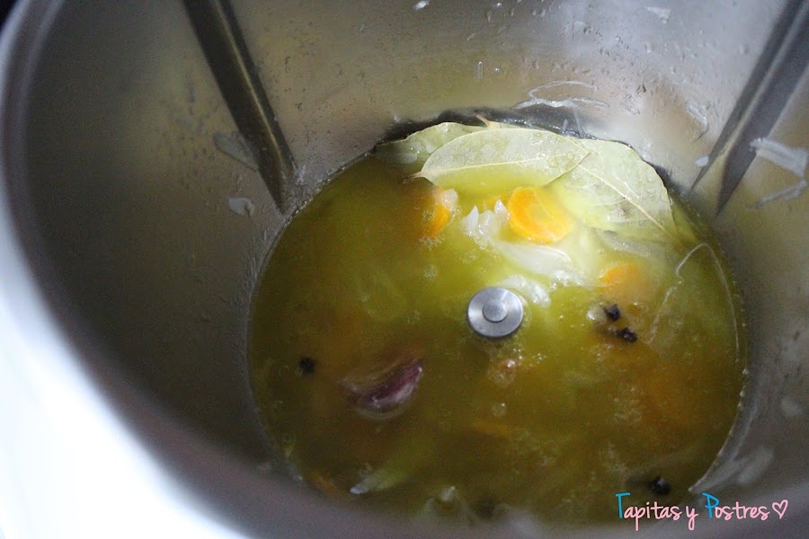 Ponemos la cebolla y la zanahoria en rodajas en el vaso junto al aceite y los ajos. Cocinamos unos minutos. Después agregamos el resto de los ingredientes.
