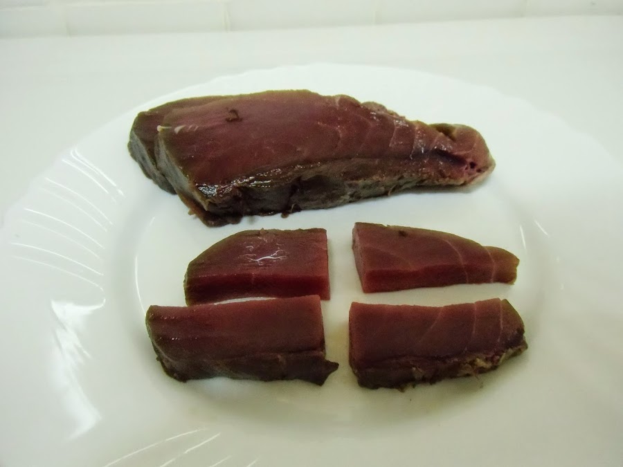 SalLavamos, secamos y cortamos el atún en trozos de unos 5 centímetros de largo y con un dedo de grosor.