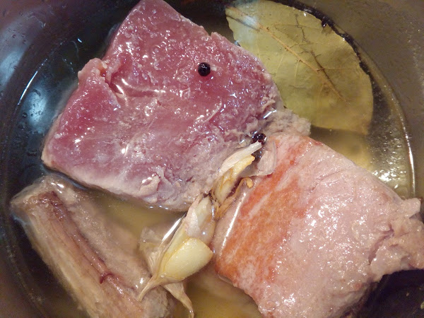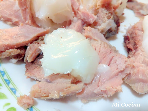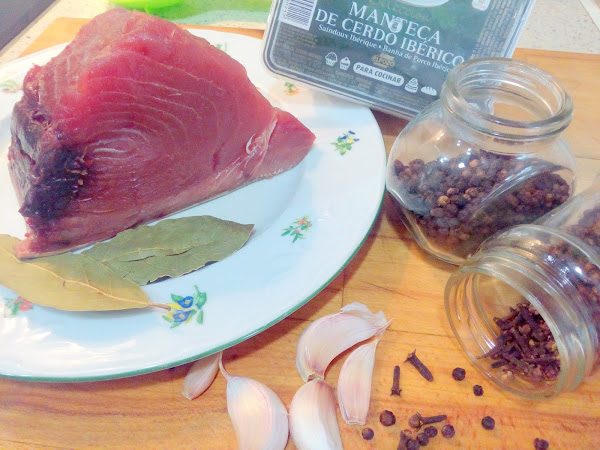 500 grms. de lomo de atún, 500 grms. de manteca de cerdo ibérica, 4 dientes de ajos, 10 granos de pimienta negra, 2 clavos de olor, 2 hojas de laurel y sal.