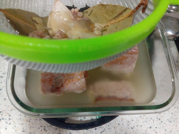 Apartar del fuego, retirar los trozos de atún y colocarlos en un recipiente de cristal que soporte bien el calor y echar la manteca por encima colándola (desechar las especias).