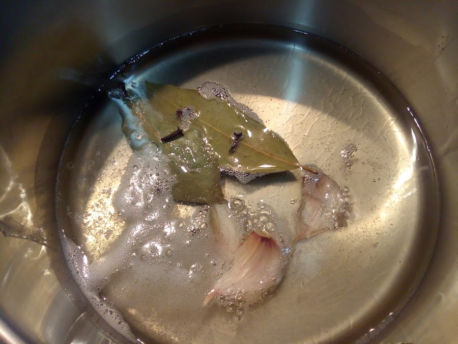 Cuando esté derretida, añadir el laurel, los granos de pimienta negra, los dientes de ajo enteros y con piel (con un golpe dado a fin de que se abra un poco) y los clavos de olor.