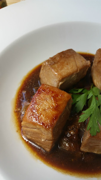 Para cocinar el atún, solo hay que ponerlo en la plancha a fuego alto durante menos de un minuto para que quede marcado por fuera pero medio hecho (tirando a poco) por dentro. Si nos pasamos, pasará igual que una ternera muy hecha: un zapato. Cuando lo tengamos hecho, lo ponemos un minuto en la misma sartén donde teníamos terminándose nuestra cebolla para que todos los sabores de complementen.