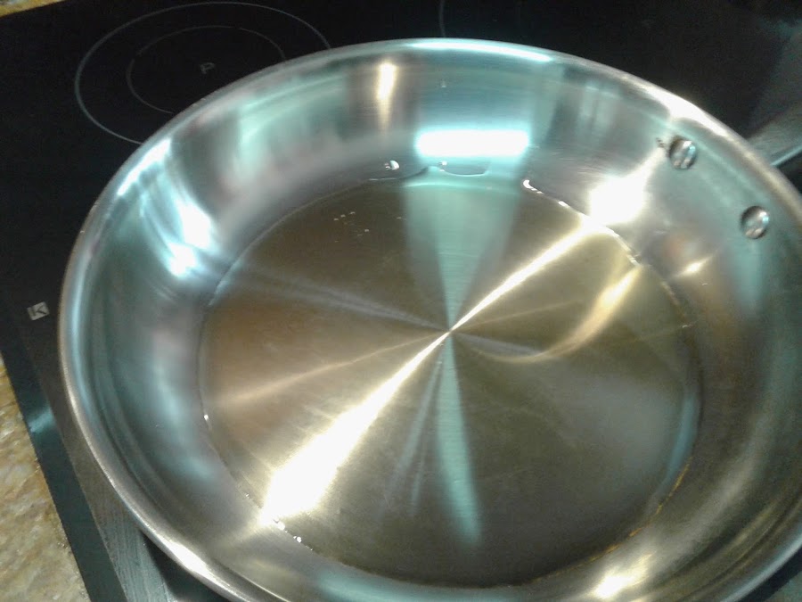 Ponemos una sarten al fuego y echamos 60 ml de aceite de oliva, o lo que más o menos es lo mismo, 6 cucharadas soperas.