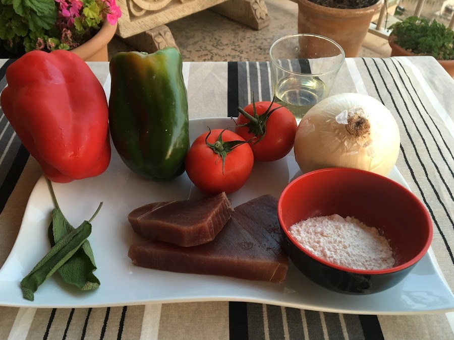 Se puede poner un poco de cebolla con pimiento encima de los lomos de atún y el resto podemos colocarlo a un lado.