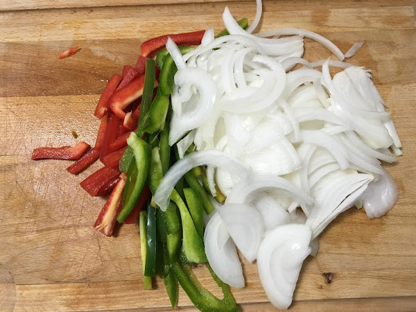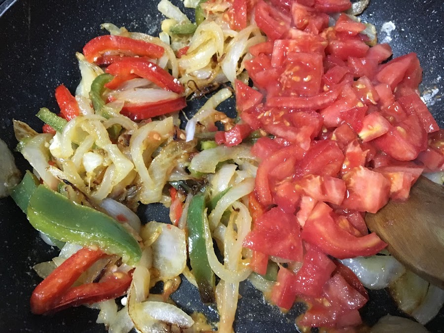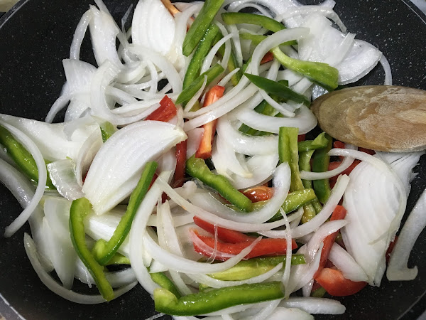 Cortamos en juliana la cebolla, el 1/2 pimiento rojo y el 1/2 pimiento verde. Y los ponemos en una sartén al fuego con un poco de aceite, sal y pimienta negra molida.