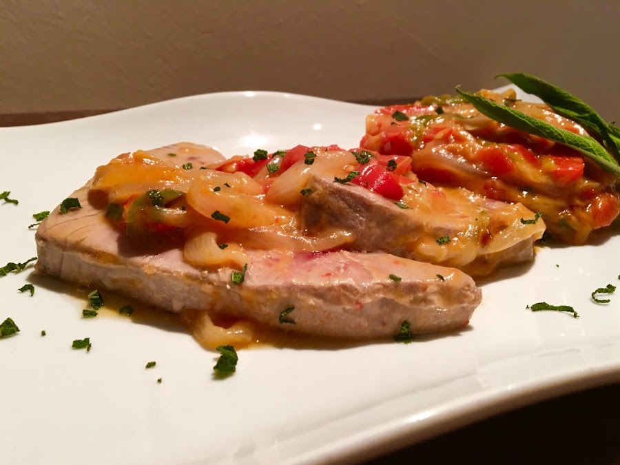 Una vez tenemos toda la salsa ligada y la salvia incoporada a la mezcla añadimos a todo el conjunto los lomos de atún. Los tendremos al fuego tapado y durante 1 minuto y medio por cada lado y pararemos el fuego.