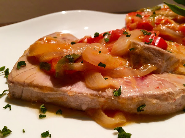 Solamente deberemos pasar los lomos de atúna un plato y servir con un poco de la verdura y cebolla.