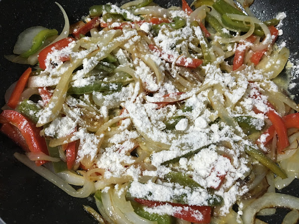 Cuando la cebolla empiece a volverse transparente le añadimos harina a todo el conjunto (la cantidad será la que espolvoreando nos quede más o menos cubierta la verdura, pero sin que la harina se amontone.