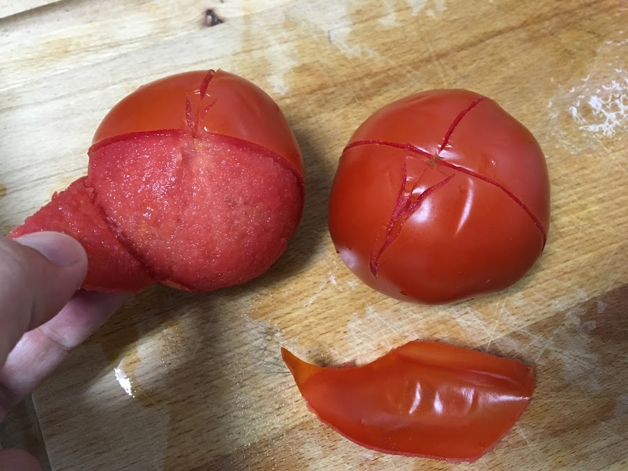 Pelamos dos tomates, los troceamos y los reservamos. (Para pelarlos con facilidad hacedles unos cortes en forma de cruz en la parte de abajo y ponedlos en agua hirviendo durante 1 minuto. Luego podreis quitarles la piel muy fácilmente)