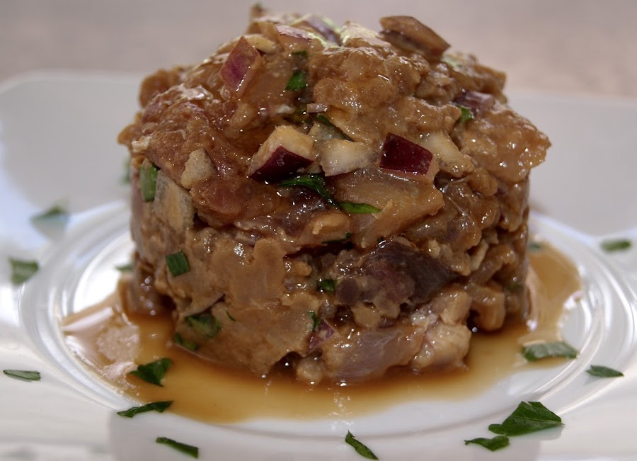 275 gr de cola de atún ( uso la cola pues es más económica que el lomo y no tiene espina). El pescado lo tienes que congelar y el día que elabores la receta lo descongelas, ya que lo preparamos crudo.