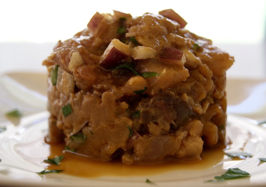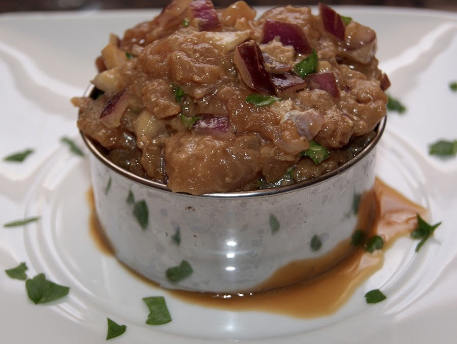 En un aro metálico, colocamos el atún con la cebolla y el perejil.