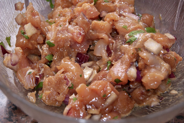 El un bol, ponemos el atún con la cebolla y el perejil cortado pequeño. Reservamos. En una taza pondremos la soja, la taína, el zumo de la lima y el jengibre rallado (como mucho una cuchara pequeña de café de jengibre rallado, tiene un sabor potente ). Añadimos al atún, removemos y lo metemos en la nevera unos 10 minutos, ya que el atún ya estaba frío, acabando de descongelar.