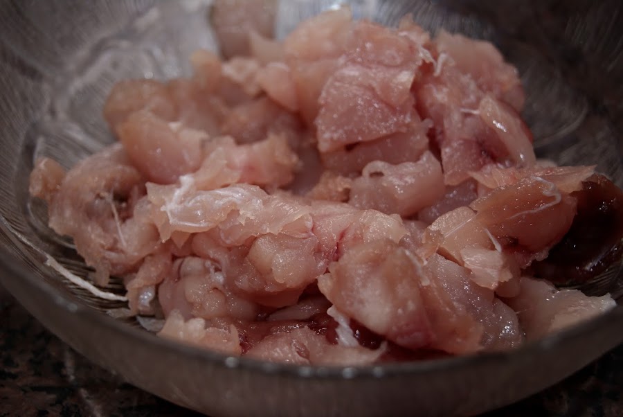 Elaboración:Descongelamos el atún, y cuando aún esté un poco congelado lo cortamos en dados no muy grandes; si lo haces así, será más fácil cortarlo