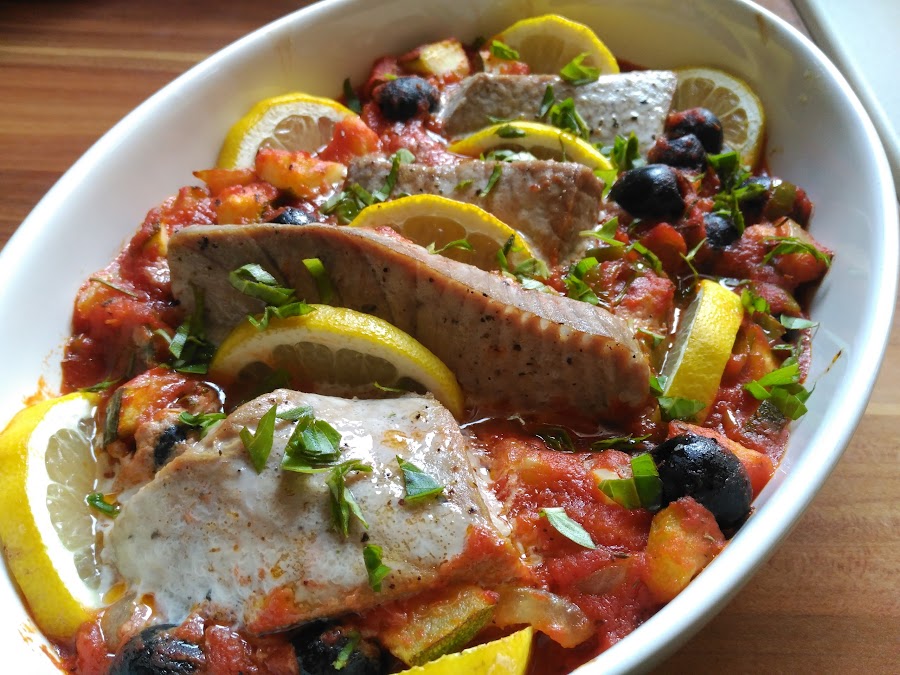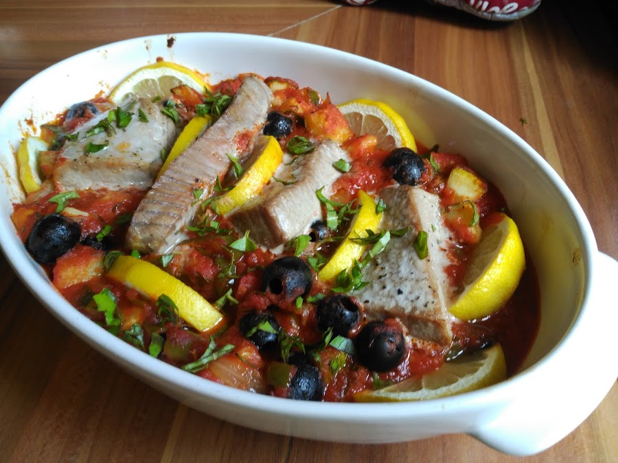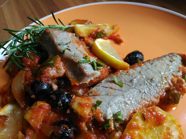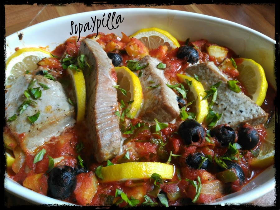 - Volcamos la salsa en una bandeja apta para horno, salpimentamos el atún y lo colocamos encima de la salsa. Añadiendo un chorritito de aceite.