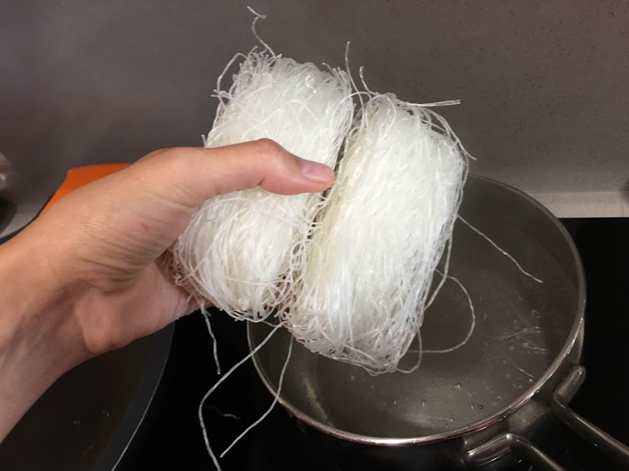 5. En una ollita pequeña ponemos a hervir agua con sal. Justo cuando empiece a hervir añadimos los fideos vermicelli y paramos el fuego. Removemos durante 1 minuto y escurrimos. Colocamos los vermicelli en un bol.