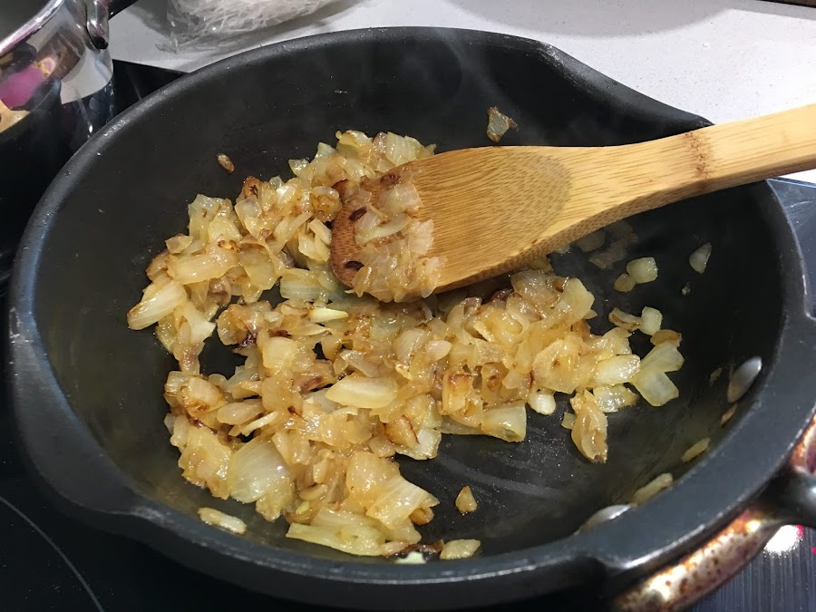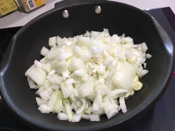3. Pelamos la cebolla y los ajos. Cortamos a trocitos muy pequeños la cebolla y laminamos los ajos, a fuego medio rehogamos hasta que tome un tono doradito.