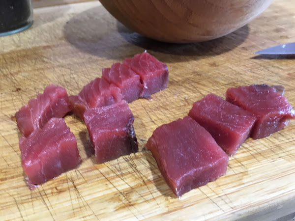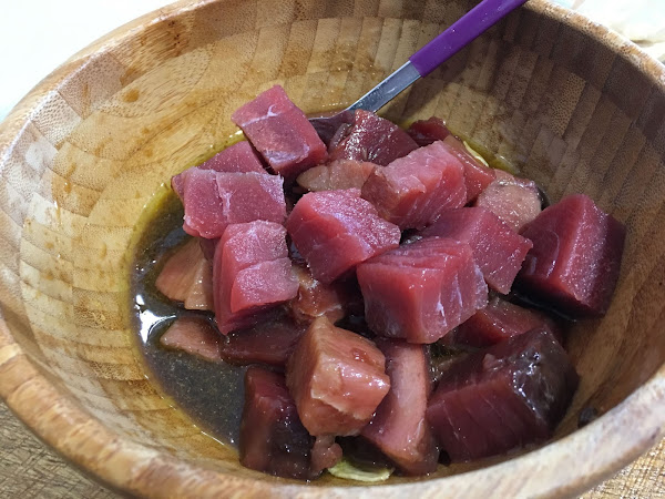 2. Lavamos el atún y cortamos las dos rodajas a dados. Los ponemos dentro del marinado, cubrimos con film y lo reservamos en la nevera durante 30 minutos.