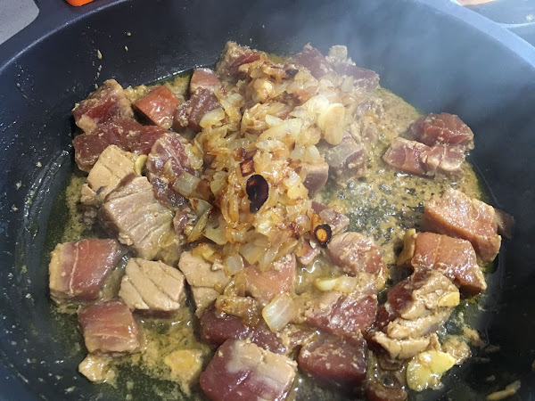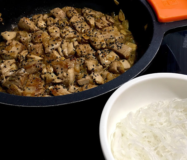 4. Pasada la media hora sacamos el atún rojo de la nevera. Ponemos una cazuela a fuego alto, vertemos el atún y la marinada y sofreímos durante 3-4 minutos, hasta que el atún esté hecho. Cuidado con no pasarse con la cocción de éste, ya que fácilmente puede quedar reseco. Ponemos el sésamo negro por encima.