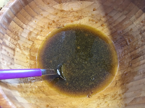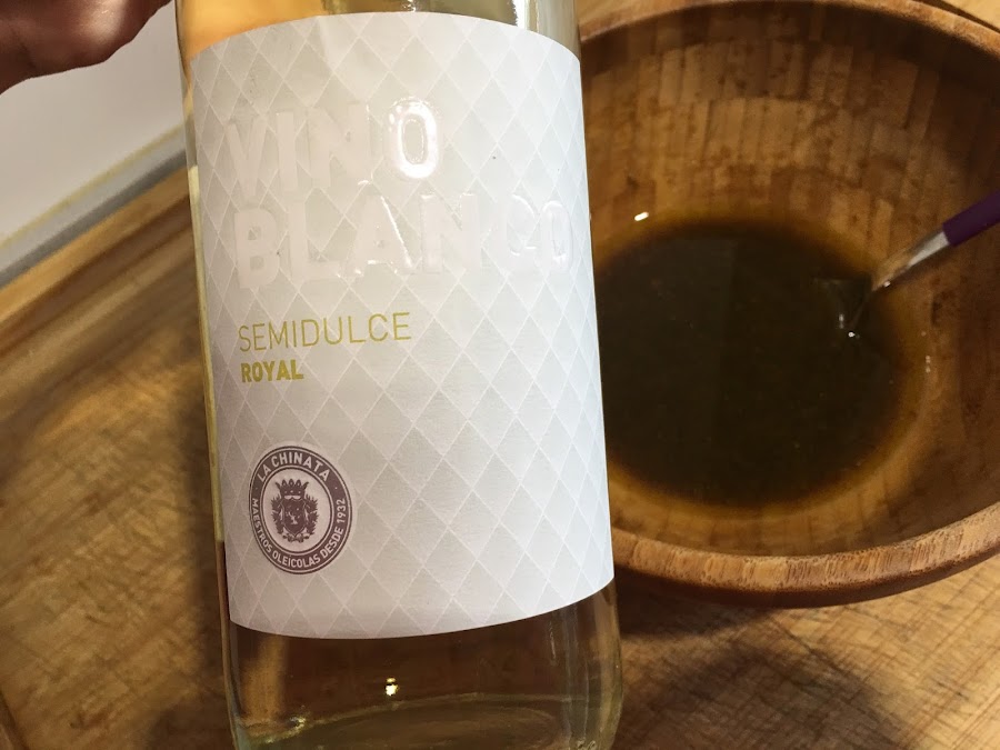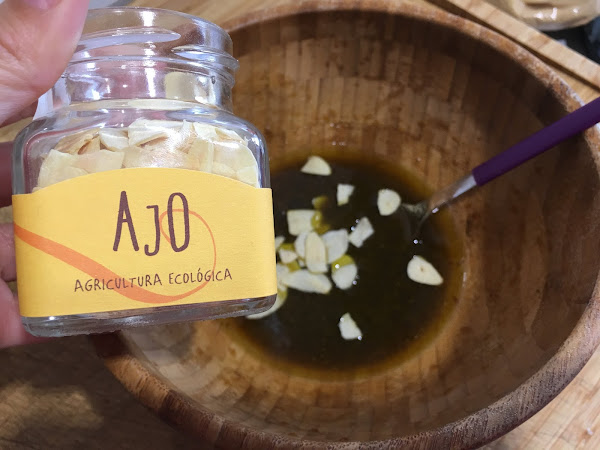 1. Empezamos preparando el marinado del atún rojo. En un bol ponemos la soja, el azúcar moreno, los ajos laminados deshidratados y el jengibre de Orballo y el vino blanco de la Chinata. Mezclamos bien.