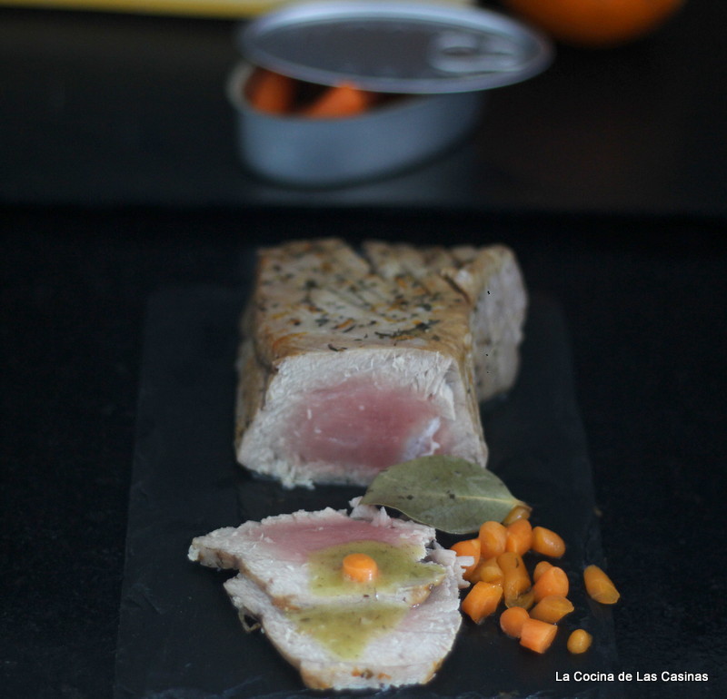 Retira el atún, deja que el escabeche reduzca un poco y emulsiona la salsa con la batidora. Corta el atún en láminas muy finas y sirve acompañado de las zanahorias cortadas y de un poco del escabeche, no mucho debe de subir el sabor pero no perder el del exquisito atún. Por eso siempre te recomiendo que adaptes a tus gustos, vinagre, aromáticas, azúcar, sal y demás.