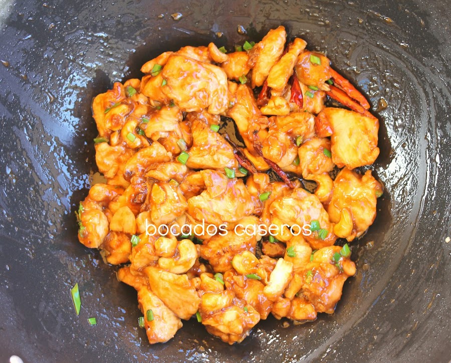 6. Añadimos los frutos secos y seguimos removiendo hasta que el pollo esté hecho.