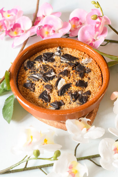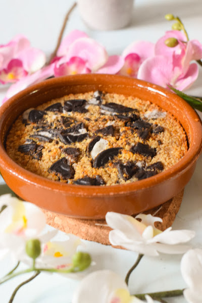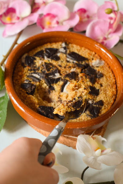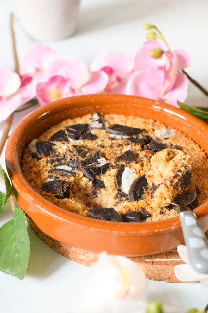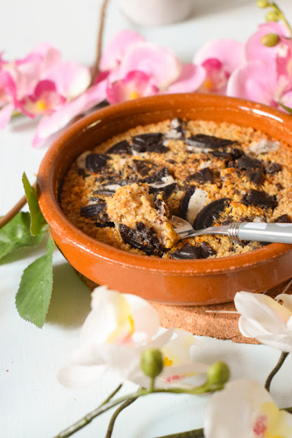 Por la costra que se hace en la superficie puede parecer que se queda seco, pero para nada. Queda muy parecido a como queda en el microondas, pero a la vez distinto. No sabría cómo explicarlo. Creo que en las fotos no se aprecia bien la consistencia que queda, pero la verdad es que merece la pena los 20 minutos de horno. Aunque si os da pereza encender el horno por el calor podéis hacer igualmente la receta en el microondas o al fuego.