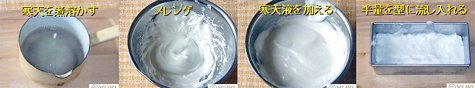 3. Batir la clara a punto de nieve, y añadir la corteza rallada y el zumo de limón. Agregar a esta mezcla, el agar cocido poco a poco, y sin dejar de batir. Mezclar bien y dejar reposar hasta que comience a espesarse.