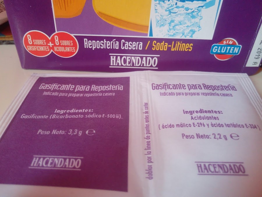 • 1 sobre doble de gasificante (1 sobre blanco y 1 morado en caso de usar los de Mercadona, sino podéis encontrarlos de otras marcas o incluso pedirlos en la farmacia)