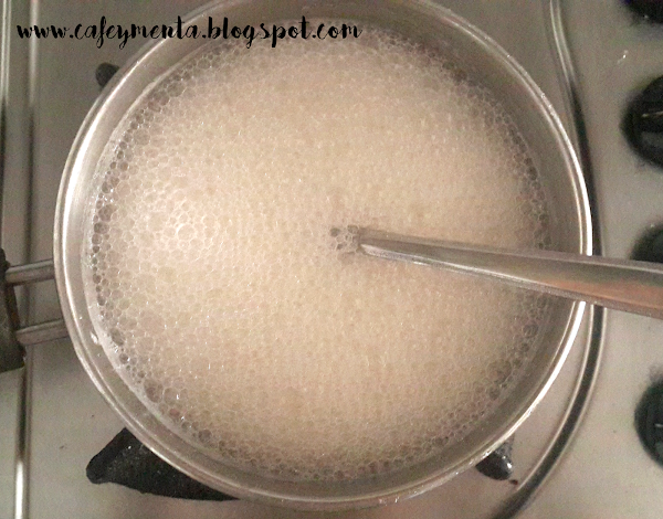 2. Cuando haya hervido, lo dejamos reposar y que se enfríe hasta que se quede a 50 º. Yo no tengo termómetro, y mi método de comprobación fue meter el dedo y que no me quemara demasiado.
