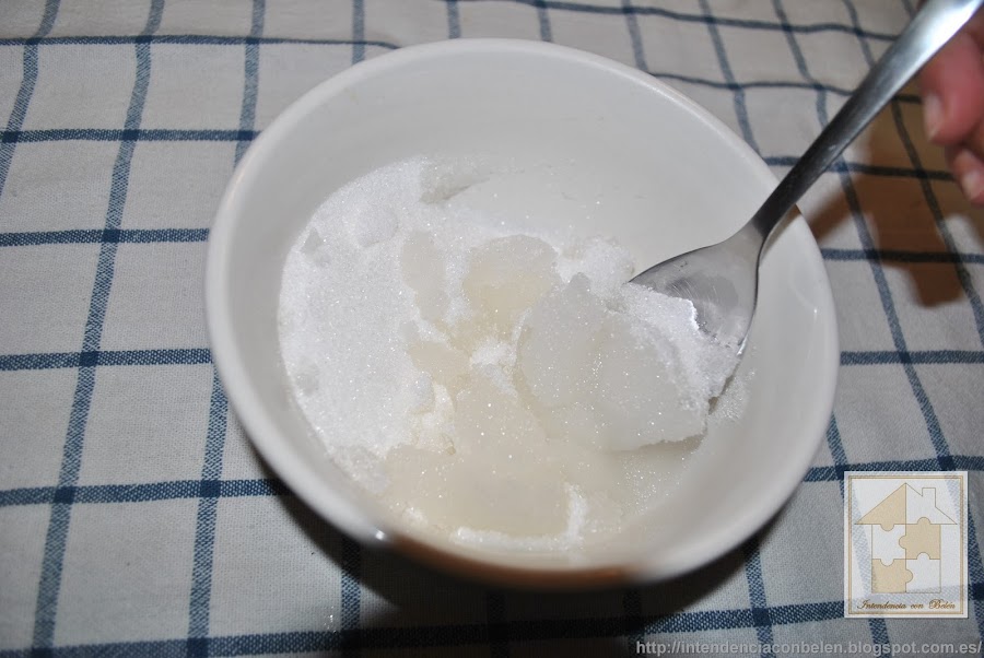 Mezclamos 220gr de azúcar con una cucharada sopera de agua y removemos hasta que el azúcar se humedezca por completo. No echéis más agua, dadle tiempo y veréis como con una cucharada es suficiente y se homogeneizará enseguida.