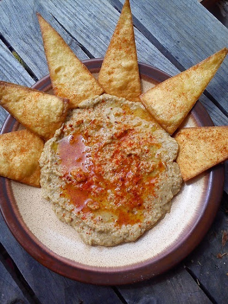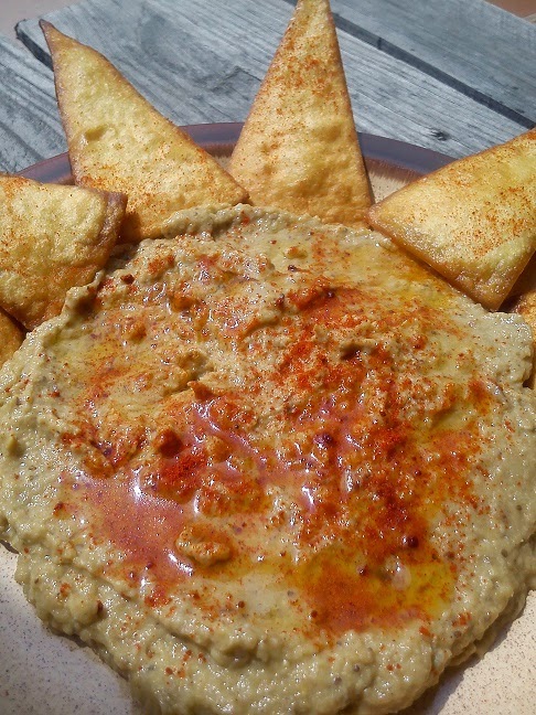 Como ya he dicho, se suele acompañar con pan de pita, pero lo serví con nachos hechos con tortillas de maíz, de las que vienen para hacer fajitas. Sólo cortarlas en triángulos y freírlas (a mis niñas les encantan con queso derretido por encima, ummmm), a estos nachos les puse un pocho de pimentón por encima. Ya solo queda coger los nachos y meterlos en el baba ganoush y disfrutar!!!!