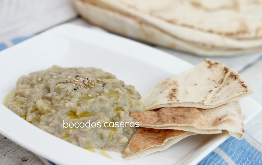 Colocamos la pulpa de la berenjena en el vaso de la batidora y mezclar con el ajo picado, el tahini, el zumo de limón, el comino, el aceite de sésamo y un poco de aceite de oliva, ir añadiendo el aceite poco a poco para que no quede la mezcla demasiado líquida.