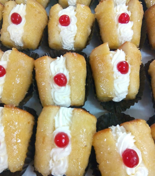 Rellenar los babas y ponerlos sobre una blonda y poner una guinda.