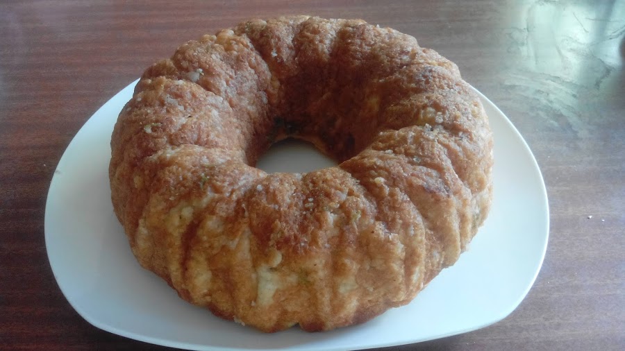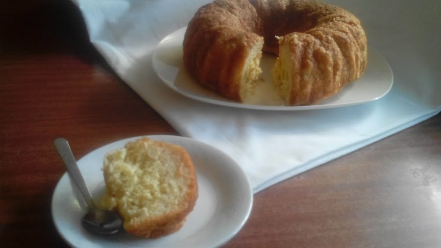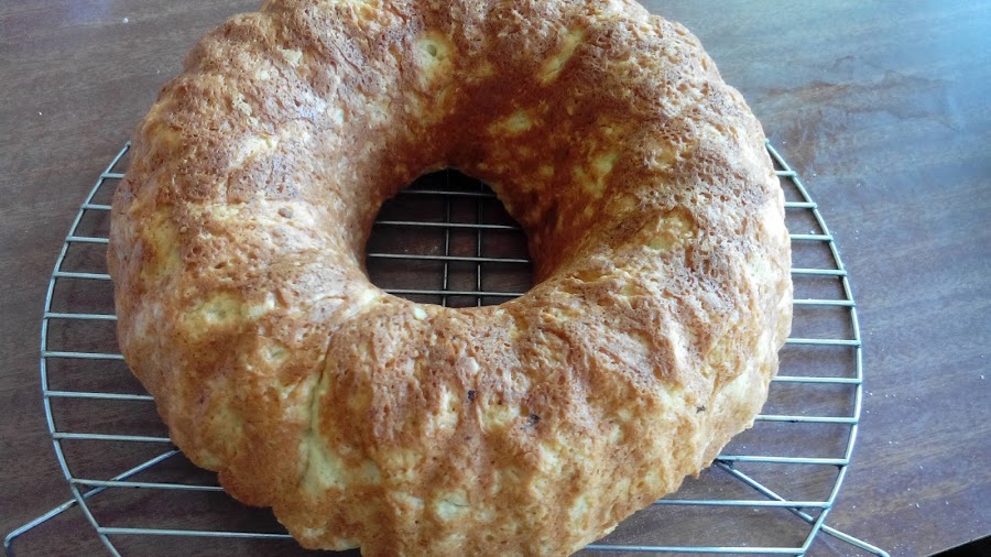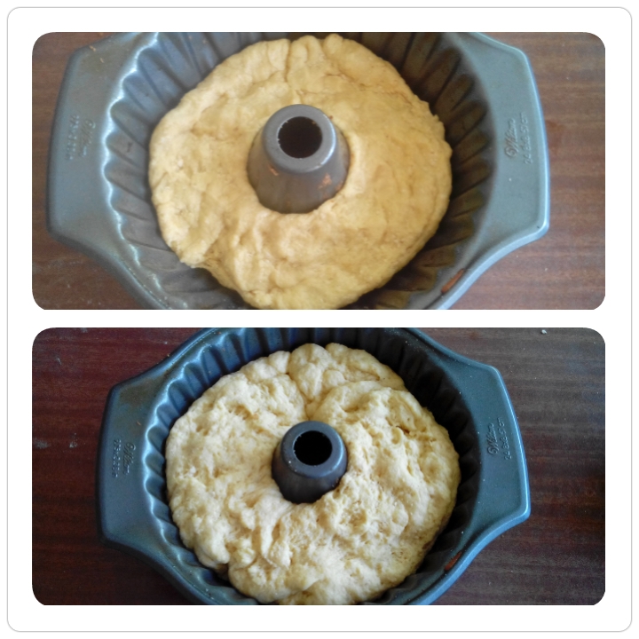 Metemos la masa en un molde de tubo/bundt previamente engrasado y cubrimos con un paño y dejamos levar por una hora o dos, hasta que duplique su tamaño.