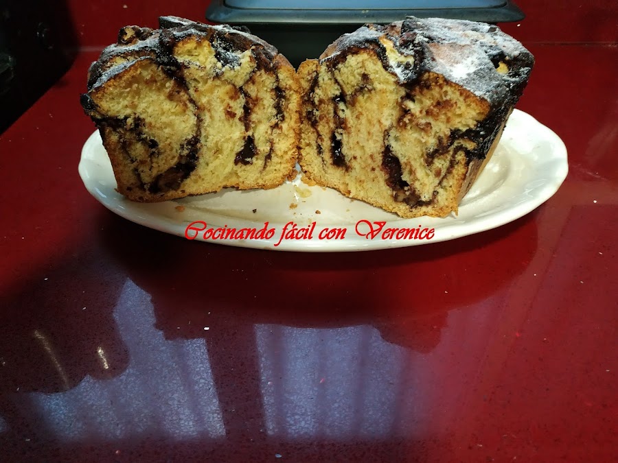 Se distribuye toda la crema de chocolate para cubrir entero el Babka y adornar con las nueces enteras.