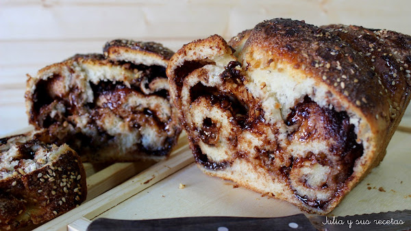 Y de allí nos ha propuesto un dulce que se prepara el Domingo de pascua y que tiene dos versiones, la rusa, cuyo nombre babka significa "abuela" y se trata de un bizcocho de forma cilíndrica relleno de frutas secas especialmente pasas y con un glaseado por encima, y la judía que se trata de una tira de masa con levadura y colocada en forma de trenza rellena de chocolate y canela que se cocina en un molde de plum cake. Es la mas conocida y por la que me he decidido yo.
