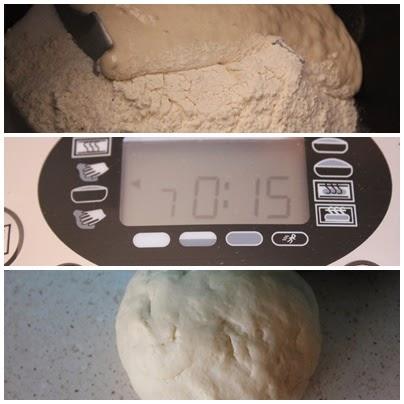 Ponemos todos los ingredientes en la panificadora menos la mantequilla y programamos el programa 6 (solo amasado), cuando lleve amasando 5 minutos iremos añadiendo los trozos de mantequilla poco a poco y dejamos que termine de amasar.