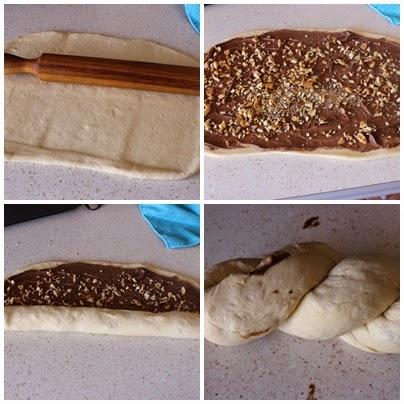 Estiramos la masa en forma rectangular lo mas fina posible. Le ponemos la Nocilla encima por todas partes y las nueces picadas. Enrollamos sobre si misma como un brazo de gitano lo mas apretado posible.