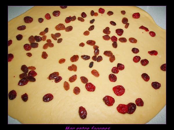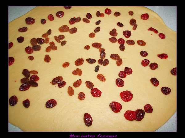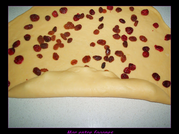 Estiramos la masa de los dos Babkas y en uno colocamos las uvas pasas y los arándanos.