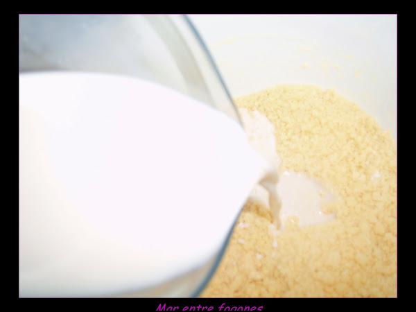 Cuando tenemos toda la leche integrada. Vamos añadiendo la mezcla de harina con sal que teníamos reservada.