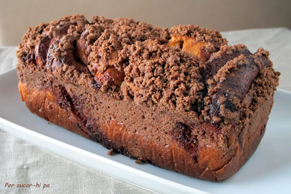 Tradicional dulce de Pascua en muchos países de Europa del Este, tiene tantos acabados como "abuelas" lo hornean, con canela, con pasas, con glaseados, ... Existe también una versión judía, que es la que más o menos hemos mirado de lejos, que trenza la masa antes de hornearla y la recubre de streusel (grumos), que nosotros hemos llamado más elegantemente crumble de frutos secos. Para el relleno hemos elegido una ganaché de chocolate al ron.