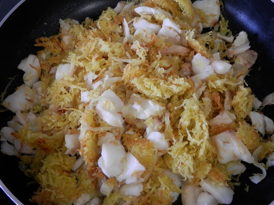 Desmenuza el bacalao y reserva.
