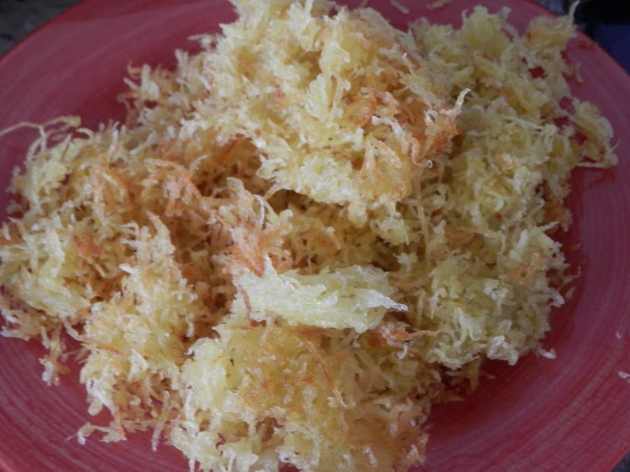 Pon abundante aceite en una sartén, cuando el aceite esté caliente, pon a freír un poco de patata rallada.