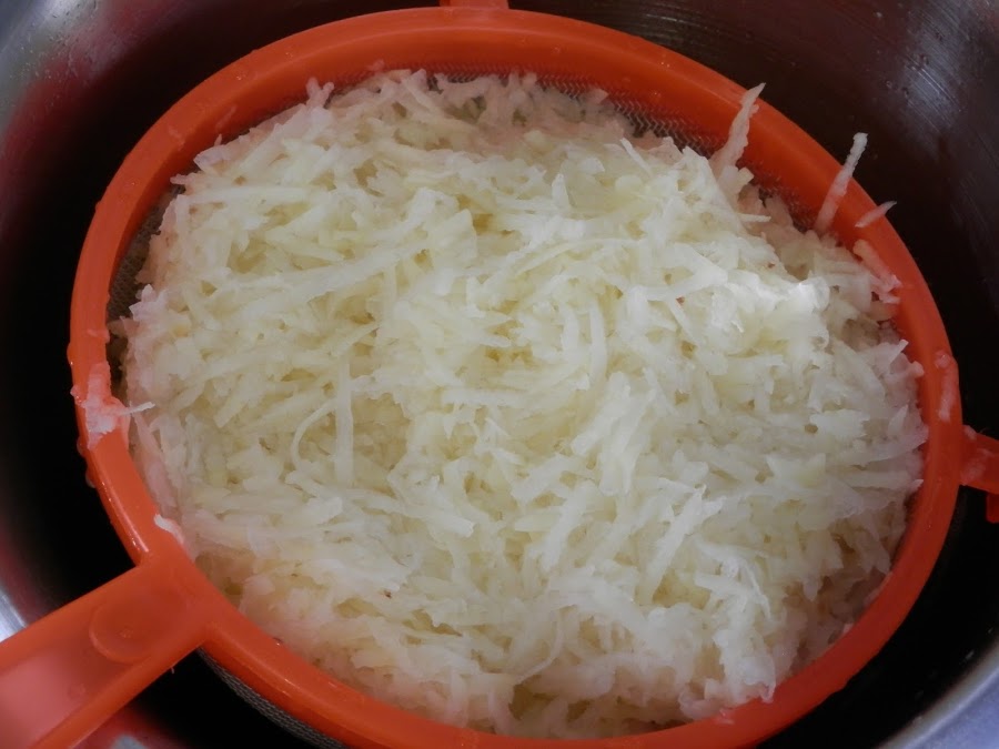 Lava la patata rallada hasta que el agua salga limpia, después escurre en un colador grande.