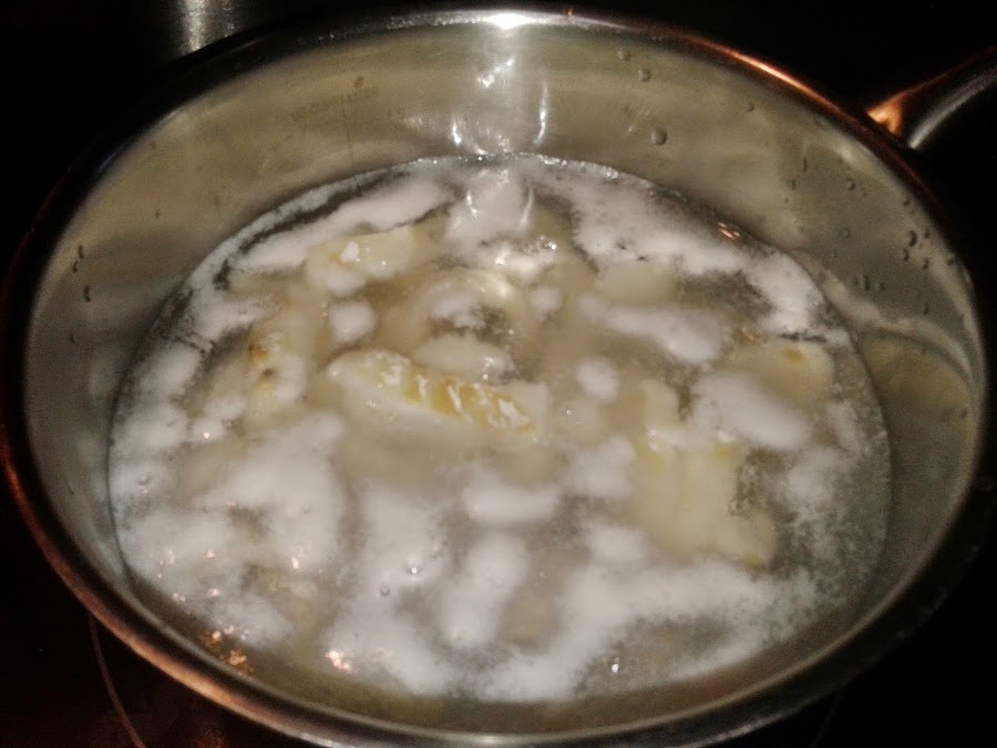 Ponemos el bacalao en agua fría y cuando rompe a hervir lo quitamos del fuego y lo dejamos en el agua 10 minutos.