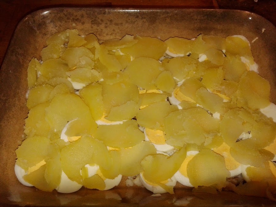 Desmenuzamos el bacalao y lo ponemos en la base de una fuente para horno