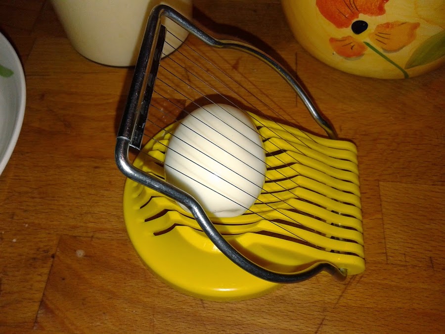 Cortamos los huevos en rodajas.He usado mi cortador pero si no tienes pues lo haces con un cuchillo.