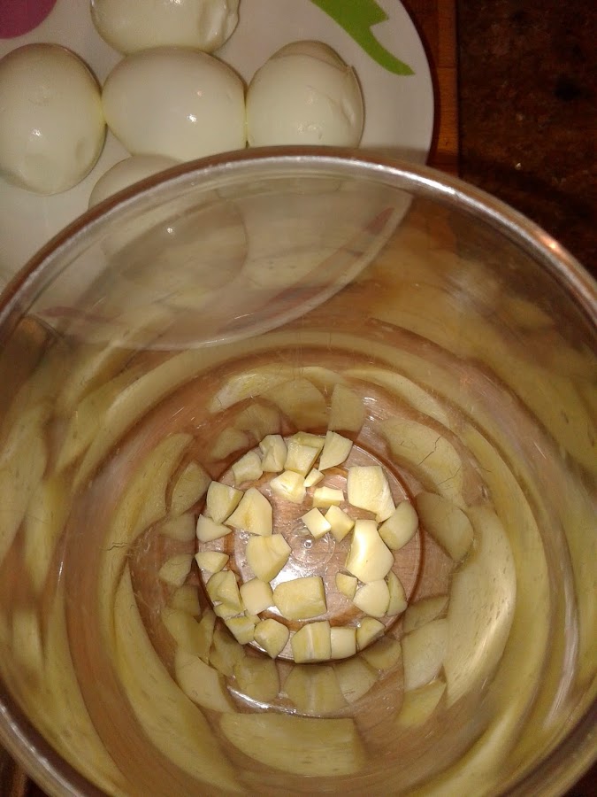 Cocemos las patatas y los huevos. Como los huevos en 10 minutos están, he hecho trampa y cuando he sacado los huevos del agua he terminado de cocer la patata 5 minutos más en el microondas.